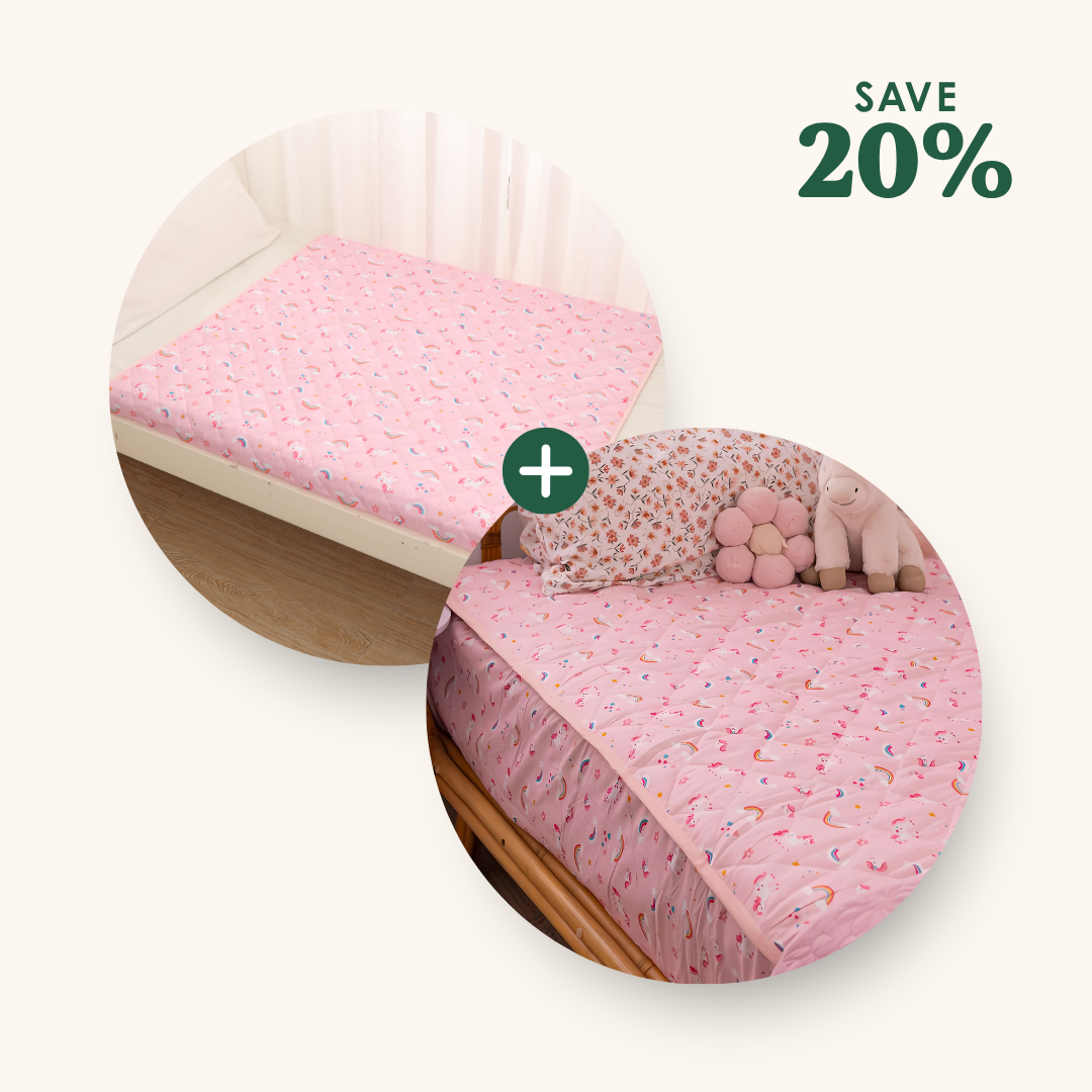 This isn’t just a waterproof layer it’s your new favourite parenting shortcut. The fitted wetbed sheet locks in leaks, protects your mattress, and feels super soft and silent. No crunchy plastic. No sweaty wake-ups.